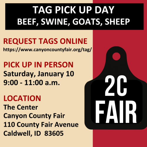 Tag pick up for Market Beef, Market Swine, Market Goats and Market Sheep. LOCATION: The Center at the Canyon County Fair. Meet us in the roundabout. You do not need to park and/or exit your vehicle. |