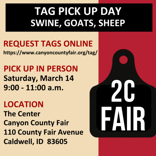 Tag pick up for Market Swine, Market Goats and Market Sheep. LOCATION: The Center at the Canyon County Fair. Meet us in the roundabout. You do not need to park and/or exit your vehicle. |
